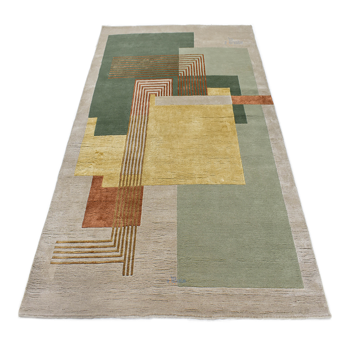 Modern Geometric Abstract Hand-Tufted Wool Rug – Earthy Green, Ochre, and Terracotta
