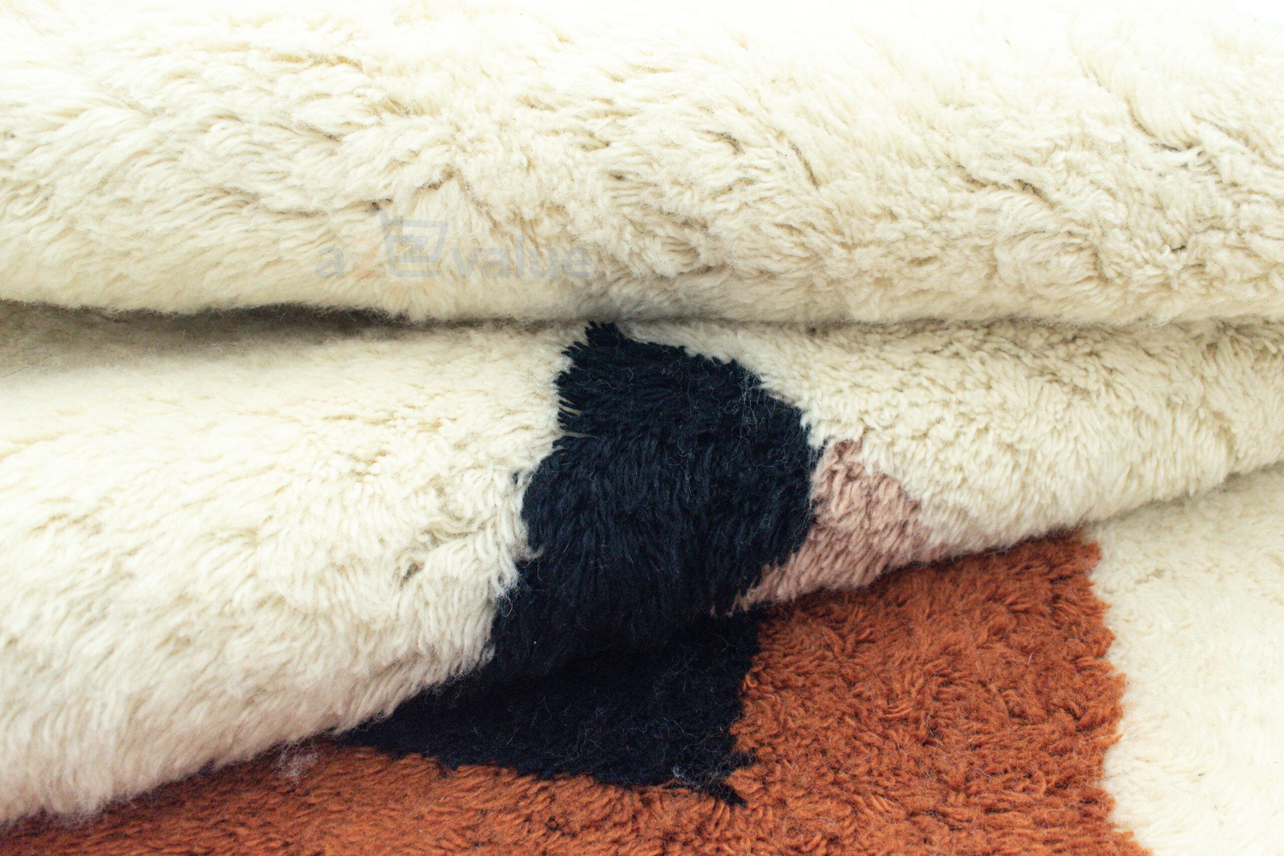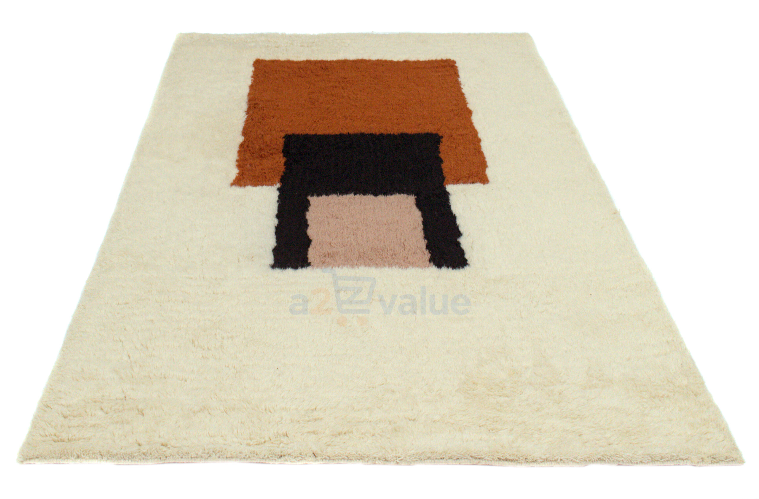 • Featuring a warm cream base with bold overlapping shapes in rust orange, deep black, and soft taupe, this rug brings minimalist sophistication and visual depth to any room.